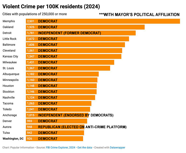 "Look at this chart, dumbass." This one often goes hand-in-hand with "Shut up, you're wrong," but it doesn't always have the intended effect. Liberal activist Judd Legum attempted a snarky retort by asking if Trump would also be sending federal authorities to crack down on crime in Tulsa, Oklahoma, which has a slightly higher violent crime rate than D.C. based on a chart he made. Sick burn, but Tulsa's mayor is also a black Democrat, so fighting crime there would be just as racist. Then we noticed something else about his stupid list of cities plagued by violent crime, which pairs nicely with Al Sharpton's suggestion that Trump would be less racist if he targeted a "Republican city."