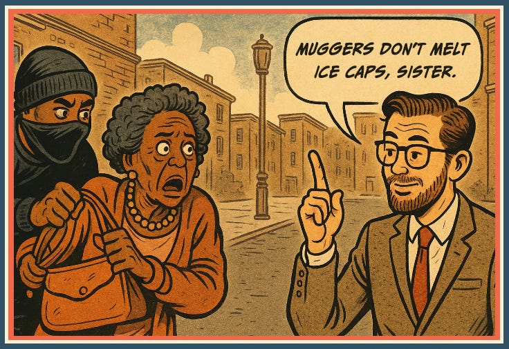 "What about climate change?" MSNBC's Joe Scarborough, who was interviewing Sanders when she urged her fellow black women to reimagine the meaning of safety, tried his best this week to stop his liberal guests from sounding like coddled elites who think armed carjackings and tweaking subway masturbators are just a charming slice of urban authenticity. He failed, obviously. "When I go to D.C., I'm not afraid of losing my wallet," MSNBC contributor Anand Giridharadas told him with a straight face (and ridiculous coif). "I'm afraid that my children's freedom to breathe will be stolen in a world where climate change policy is non-existent."