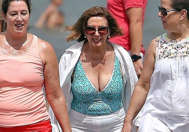 Pelosi, who has represented the filth-infested crime hole of San Francisco since 1987, is best known for flaunting her imposing jugs at an Italian beach resort in 2022. Her other notable achievements include amassing a personal fortune of up to $400 million thanks to her husband Paul Pelosi’s exceedingly well-timed stock trades, and almost single-handedly prying the Democratic nomination from Joe (and Jill) Biden’s rigor mortis grip in 2024. That same year, she became the first member of Congress to have hip replacement surgery in Luxembourg. Advocates of symbolic diversity have also praised Pelosi for becoming the first female speaker of the House in 2007 and serving as party leader for 15 years.