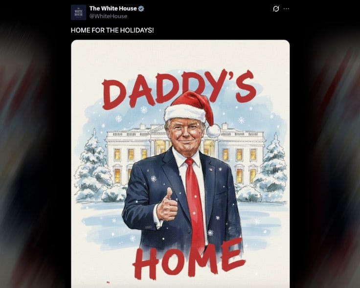 Meanwhile, on Air Force One: The president of the United States stood by his social media post describing Walz as “seriously retarded.” Reporters were offended, obviously, but Trump didn’t budge. “I think there’s something wrong with him, absolutely,” he said. Days later, the White House urged Americans to enjoy “the holidays” in what can only be described as a stunning retreat in the long-running War on Christmas.