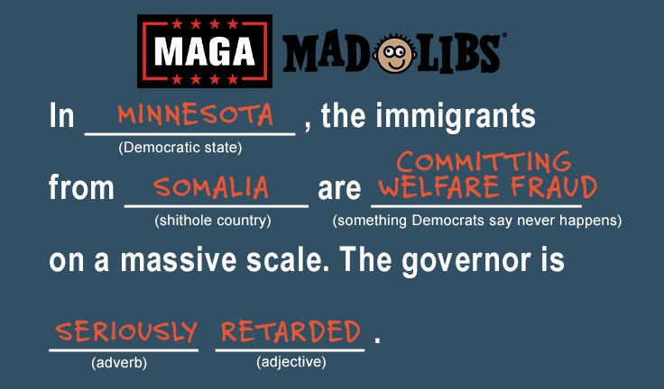 MAGA Mad Libs (Minnesota Edition): In an even more egregious example of a Democratic-run state disgracing itself on the national stage, what’s happening in Minnesota these days is almost too ridiculous to believe. What might have once been dismissed as a paranoid right-wing fever dream is actually happening. Something the preeminent fact-checker Daniel Dale might be ranting breathless about on CNN while a concerned Jake Tapper nods along.