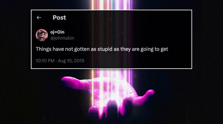 First, an apology. We forgot to acknowledge the 10th anniversary of Tabin’s Law. It is arguably the most—if not the only—insightful observation ever posted on a social media platform. Here’s what the prophet John Tabin wrote on August 10, 2015, less than a week after the first Republican primary debate and Donald Trump’s infamous quip—at the time, anyway—about Megyn Kelly’s menstrual cycle in an interview with CNN’s Don Lemon.