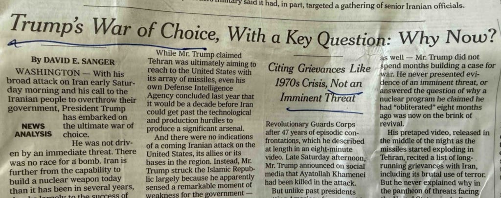 The Democrat-aligned press offered the same interpretive framework. "Trump’s War of Choice, With a Key Question: Why Now?" was the front-page headline over a New York Times article by David Sanger, who teaches a class at Harvard on "Central Challenges of American National Security, Strategy, and the Press." Sanger described the U.S. military action as "the ultimate war of choice" and noted, "In international law, the difference between a war of necessity and a war of choice is huge."