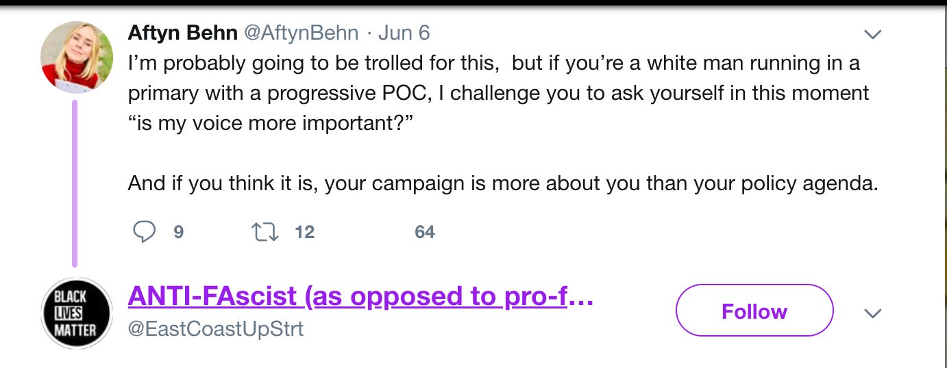“I’m probably going to be trolled for this, but if you’re a white man running in a primary with a progressive POC, I challenge you to ask yourself in this moment, ‘is my voice more important?’” Behn wrote in a social media post in 2020. “And if you think it is, your campaign is more about you than your policy agenda.”